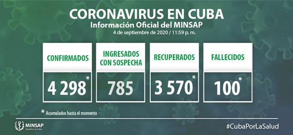 De los 4 mil 298 pacientes diagnosticados con la enfermedad, se mantienen ingresados confirmados 626 (14,6%), 604 el 96,5% con evolución clínica estable. Se reportan 100 fallecidos (ninguno del día), dos evacuados y se acumulan 3 mil 570 pacientes recuperados (82%) (83 altas del día). Se reportan cuatro pacientes en estado crítico y 18 en estado grave.