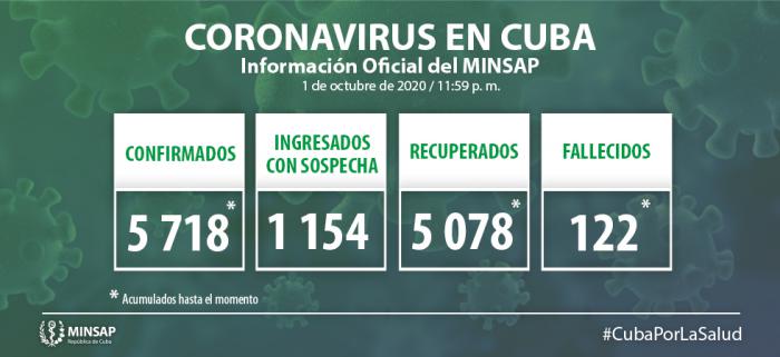 Al cierre del día de ayer, 1 de octubre, se encuentran ingresados en hospitales para vigilancia clínica epidemiológica 6 mil 408 pacientes, de ellos: en vigilancia 4 mil 738, sospechosos mil 154 y confirmados 516. Para COVID-19 se estudiaron 7 mil 545 muestras, resultando 48 muestras positivas. El país acumula 628 mil 725 muestras realizadas y 5 mil 718 positivas (0,91%).
