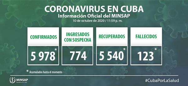 - Ciudadana cubana de 34 años de edad, residente en el municipio Sancti Spíritus, provincia del mismo nombre. Contacto de casos confirmados anteriormente. Se mantienen en vigilancia 10 contactos.
