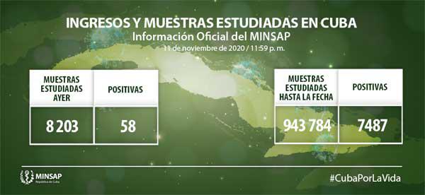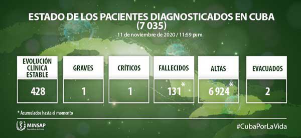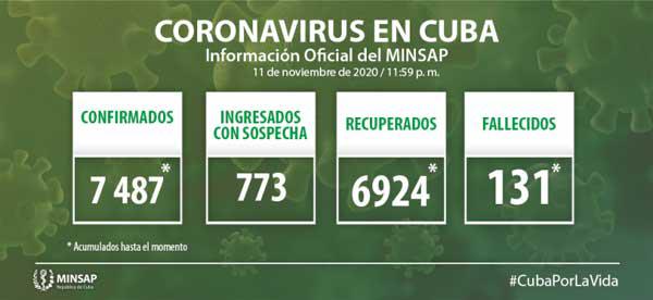 Falleció ciudadano cubano de 58 años de edad. Procede del municipio Consolación del Sur, provincia Pinar del Río. Antecedentes Patológicos Personales: Hipertensión Arterial, Diabetes Mellitus, Cirrosis hepática, Insuficiencia Renal crónica (tratamiento con hemodiálisis). Ingresa en centro de aislamiento por ser contacto de caso confirmado y se le realiza PCR que resultó negativo. Posteriormente comenzó con tos seca, falta de aire y rinorrea, es realizado PCR que resulta positivo para COVID-19. Se trasladó al hospital y es ingresado en sala de confirmados. Se pone tratamiento según protocolos de atención para estos pacientes. En su evolución presentó decaimiento, obnubilación, íctero, sudoración y relajación de esfínteres, fue trasladado a la unidad de cuidados intensivos, es diagnosticada hipoglicemia y presencia de ascitis. En el Rx lesiones inflamatorias en ambos campos pulmonares. Durante los cinco días posteriores mantuvo estabilidad hemodinámica, con oxígeno suplementario, realizándose hemodiálisis diaria y cumpliendo tratamiento según protocolo. Presentó empeoramiento clínico, radiológico y gasométrico, aparecen edemas generalizados, anuria, mantiene régimen de hemodiálisis diaria, cumpliendo el protocolo de tratamiento. El día 10 de noviembre presenta deterioro neurológico, hipoglucemia, midriasis bilateral, hipotensión arterial, acidemia metabólica, es apoyado con aminas y decidida realización de hemodiálisis de urgencia. El día 11 de noviembre muestra agobio respiratorio, es intubado y ventilado en modalidad controlada, elevada las dosis de aminas. Hace bradicardia extrema, hasta la parada cardíaca, fueron realizadas maniobras de reanimación cardiopulmonar que no son efectivas. Paciente fallece. Es realizada necropsia. Lamentamos profundamente lo sucedido y trasmitimos las condolencias a sus familiares y amigos.