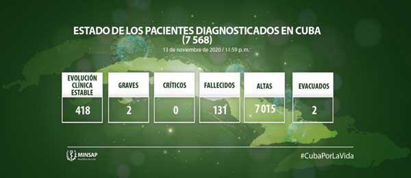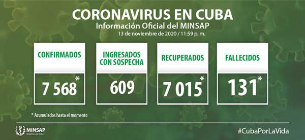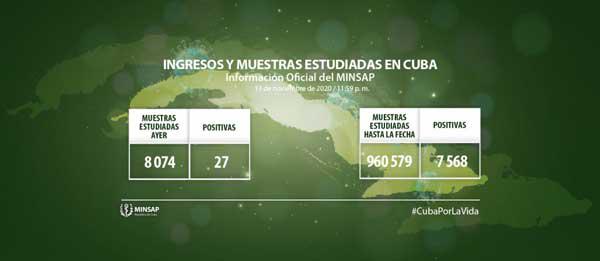 Al cierre del día de ayer, 13 de noviembre, se encuentran ingresados para vigilancia clínica epidemiológica 2 mil 539 pacientes, sospechosos 609, en vigilancia mil 510 y confirmados 420. Para COVID-19 se estudiaron 8 mil 074 muestras, resultando 27 muestras positivas. El país acumula 960 mil 579 muestras realizadas y 7 mil 568 positivas.