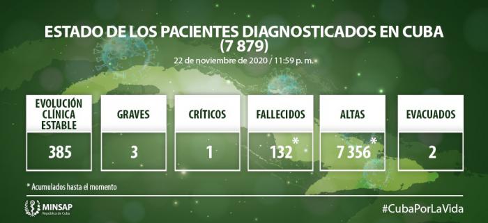 De los 7 879 pacientes diagnosticados con la enfermedad, se mantienen ingresados confirmados 389 (4.9 %), 385 (98,9 %) con evolución clínica estable. Se reportan 132 fallecidos (ninguno en el día), dos evacuados, 22 altas del día, se acumulan 7 356 pacientes recuperados (93.4 %) y cuatro pacientes en cuidados intensivos, un crítico y tres graves.