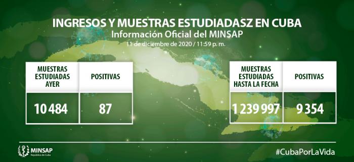 Para COVID-19 se estudiaron 10 484 muestras, resultando 87 muestras positivas. El país acumula un 1 239 997 muestras realizadas y 9 354 positivas (0,75 %).