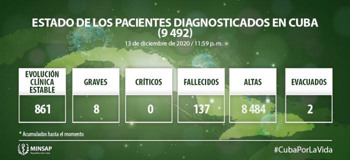 De los 9 588 pacientes diagnosticados con la enfermedad, se mantienen ingresados confirmados 857 (8,9 %), 847 (98,8 %) con evolución clínica estable. Se reportan 137 fallecidos (ninguno del día), dos evacuados, 108 altas del día, se acumulan 8 592 pacientes recuperados (89,6 %), dos críticos y ocho graves.