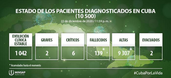 De los 10 mil 500 pacientes diagnosticados con la enfermedad, se mantienen ingresados mil 049 (9,99%), mil 042 (99,3%) con evolución clínica estable. Se reportan 139 fallecidos, dos evacuados, tres retornados a sus países, 88 altas del día, se acumulan 9 mil 307 pacientes recuperados (88,6%). Se atienden en las terapias intensivas ocho pacientes confirmados, de ellos 6 críticos y 2 graves.