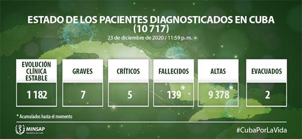 De los 10 mil 717 pacientes diagnosticados con la enfermedad, se mantienen ingresados mil 194, de ellos mil 182 con evolución clínica estable. Se reportan 139 fallecidos, dos evacuados, cuatro retornados a sus países, 71 altas del día, se acumulan 9 mil 378 pacientes recuperados (87,5%). Se atienden en las terapias intensivas 12 pacientes confirmados, de ellos cinco críticos y siete graves.
