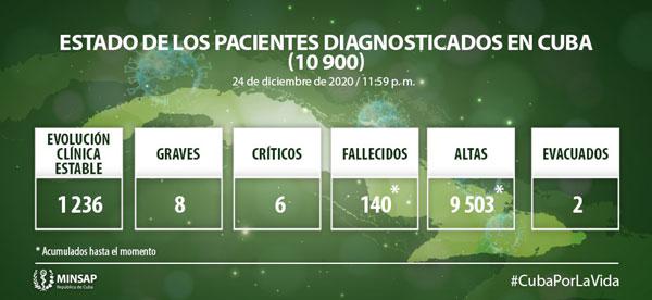 De los 10 mil 900 pacientes diagnosticados con la enfermedad, se mantienen ingresados mil 250 (11,5%), mil 236 (98,9%) con evolución clínica estable. Se reportan 140 fallecidos (uno del día), dos evacuados, cinco retornados a sus países, 125 altas del día, se acumulan 9 mil 503 pacientes recuperados (87,2%). Se atienden en las terapias intensivas 14 pacientes confirmados, de ellos seis críticos y ocho graves.