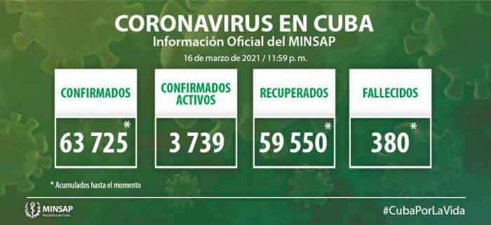 De los 63 mil 725 pacientes diagnosticados con la enfermedad, se mantienen ingresados 3 mil 739, de ellos 3 mil 675 con evolución clínica estable. Se acumulan 380 fallecidos (cuatro en el día), dos evacuados, 54 retornados a sus países, en el día hubo 940 altas, se acumulan 59 mil 550 pacientes recuperados (93,4%). Se atienden en las terapias intensivas 64 pacientes confirmados de ellos 33 críticos y 31 graves.