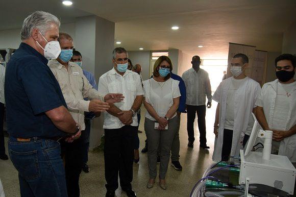 La Directora de la institución, Ing. MSc. Niurka Carlos Pías, expuso al mandatario los proyectos vinculados al enfrentamiento a la pandemia, tales como cinco diagnosticadores propios, que sirven tanto para evaluar inmunogenicidad de la vacuna como la presencia de la infección del virus.