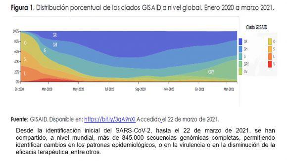 “Desde la identificación inicial del SARS-CoV-2, hasta el 22 de marzo de 2021, se han compartido, a nivel mundial, más de 845 000 secuencias genómicas completas, permitiendo identificar cambios en los patrones epidemiológicos, en la virulencia o en la disminución de la eficacia terapéutica, entre otros. Predomina el Clado G y sus derivados”, dijo.