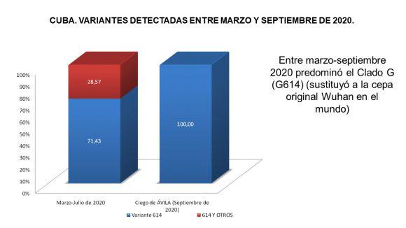 En el caso de Cuba, los estudios comenzaron con los primeros casos. En el periodo de marzo a julio predominó la variante 614, más frecuente aún en el mundo. En el estudio durante el brote de Ciego de Ávila, todas las muestras respondieron a esta variante.