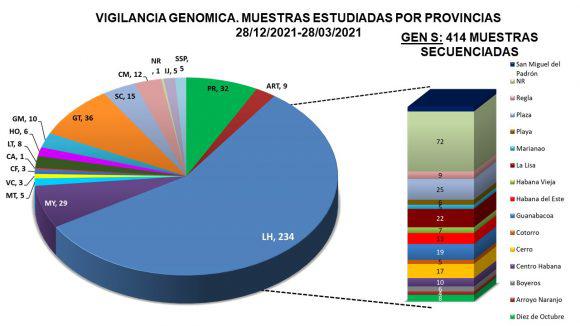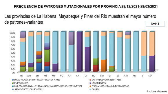 Entre el 28 de diciembre y el 28 de marzo, entraron al laboratorio un total de 414 muestras, la mayoría de La Habana por la situación existente en la capital. En el periodo se han detectado cinco variantes genéticas y seis patrones mutacionales. “No todas tienen el mismo peso, pero están”.