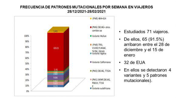 Se estudiaron 71 viajeros, el 91.5% de la primera quincena de enero, y 32 de Estados Unidos. En viajeros, en la primera quincena de enero, se detectaron nueve variantes-patrones. Una quincena después, se observa la aparición e incremento en el tiempo de cinco variantes y seis patrones mutacionales.