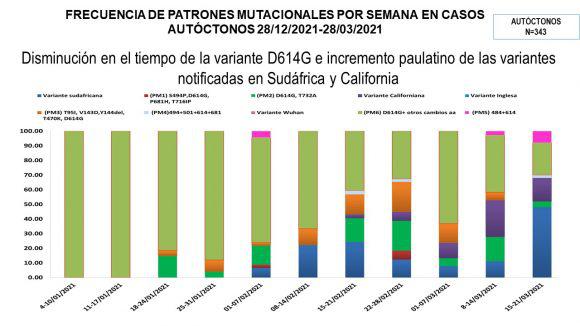 “En resumen, se mantiene la variante 614 como predominante, pero circulan otras variantes y dentro de ellas, en segunda prioridad, la notificada en Sudáfrica, y en tercera, la de California”, dijo.