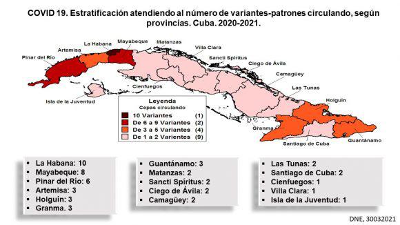 En este estudio de muestras más reciente, se confirma que la variante circulante en todo el país ha sido la 614. Mientras, la de Sudáfrica se ha concentrado en La Habana y se identificó en Matanzas, Ciego de Ávila y Guantánamo. La variante de California se detectó en siete provincias, la mayor parte de los casos también en La Habana.