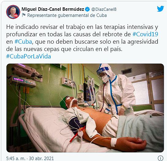 El Primer Secretario del Comité Central del Partido Comunista y Presidente de la República, Miguel Díaz-Canel Bermúdez, informó que ha indicado revisar el trabajo en las terapias intensivas y profundizar en todas las causas del rebrote de COVID-19 en Cuba.