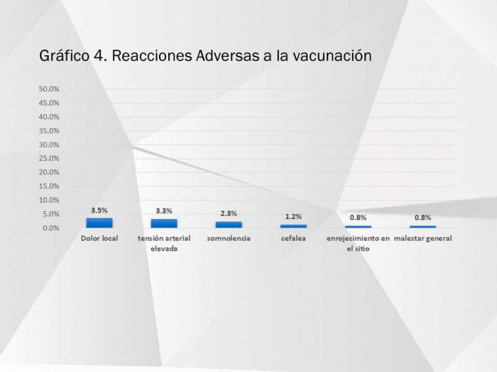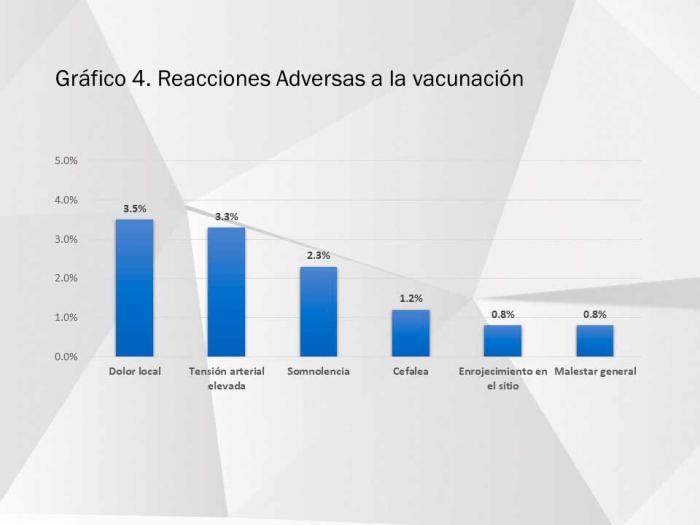 “Los eventos adversos relacionados con la vacunación han sido mínimos, solo se presentaron en 56 de los trabajadores, representando el 1.7% del total vacunado. Fundamentalmente, han sido dolor local o enrojecimiento en el lugar de la inyección, cefalea, somnolencia, malestar general y tensión arterial elevada, Todas leves, que no requirieron ingreso.