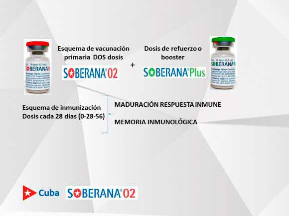 De acuerdo a la Dra. Dagmar García Rivera, directora de Investigaciones del Instituto Finlay de Vacunas, el esquema de vacunación con dos dosis de Soberana 02 y una de Soberana Plus, con un intervalo de 28 días, busca madurar la respuesta inmune y la inducción de la memoria inmunológica en el organismo. Aunque confirmó que el esquema de tres dosis es la apuesta definitiva, también analizan qué sucede luego de las dos primeras.