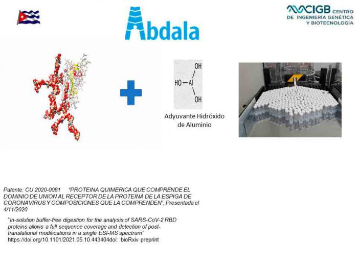 Este candidato vacunal, diseñado por el CIGB, “está compuesto por el ingrediente farmacéutico activo, que es el RBD (dominio de unión al receptor, por sus siglas en inglés), el cual es coadyuvado a la formulación con hidróxido de aluminio y otros componentes”.