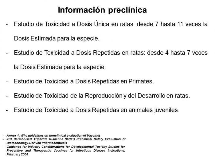 Comentó que previamente se hicieron estudios con varias especies de animales, los cuales permitieron estudiar la toxicidad varias veces, bajo el cumplimiento de las buenas prácticas establecidas por las organizaciones sanitarias internacionales, que señalan que hay que aplicar de siete a 11 veces la dosis del candidato en diferentes especies para estudiar cómo se comporta, si existe toxicidad, y poder prever su comportamiento en seres humanos.