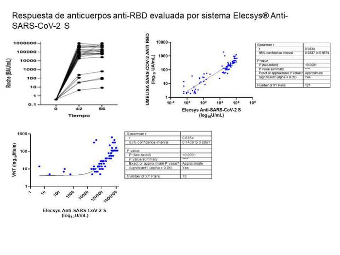 Al analizar los resultados obtenidos con el kit de la compañía Roche, respecto a la respuesta de anticuerpos anti-RBD, se apreció que existe una correlación directa entre estos y los obtenidos con las técnicas analíticas creadas en el Centro de Inmunoensayo y, además, con los ensayos en vivo.