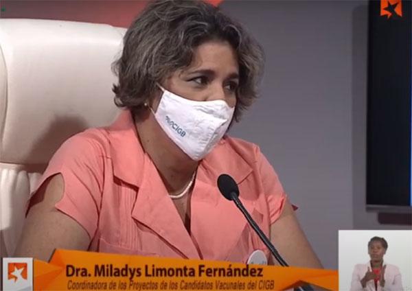 La Dra. Miladys Limonta Fernández, coordinadora de los proyectos de los candidatos vacunales del CIGB, comenzó su intervención en la Mesa Redonda refiriéndose al trabajo de aseguramiento de varias instituciones para garantizar la producción de millones de dosis de los candidatos vacunales cubanos, que serán distribuidas en La Habana y el resto del país.