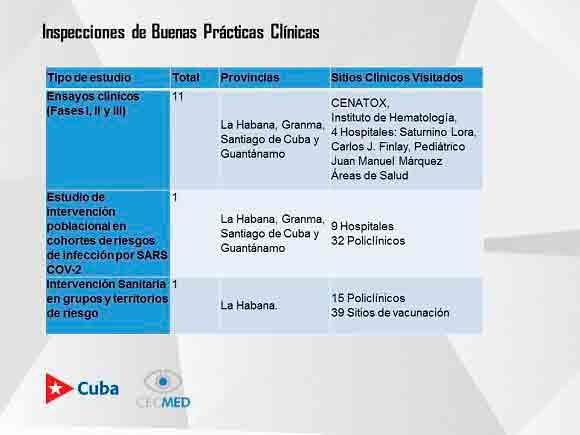 Por otra parte, la especialista destacó que se inspeccionó la Empresa Comercializadora de Medicamentos (ENCOMED), que ha tenido un papel trascendental en el desarrollo de los ensayos clínicos y la intervención sanitaria, en cuanto al manejo, transporte y conservación de los productos de investigación.