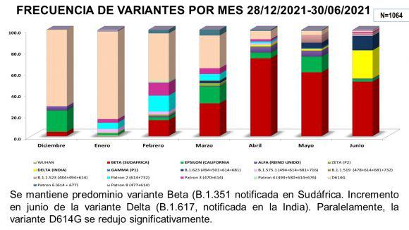 “La alfa la hemos detectado en varias provincias; sin embargo, no se impuso, lo que no quiere decir que no circule, pero no se ha impuesto, como sí hizo en Europa, en Reino Unido, en su momento. La beta sí se impuso y se extendió. La gamma la hemos detectado solo en dos casos. La delta, la última en ser detectada, se aprecia que está imponiéndose”.