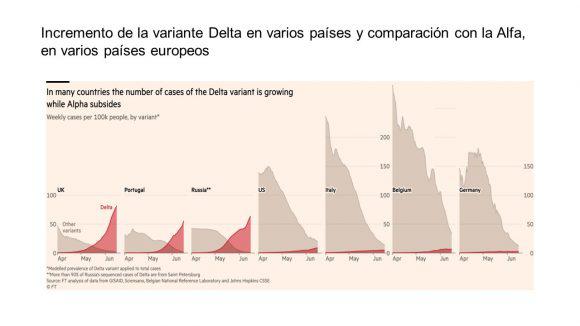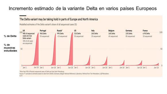 Desde enero hasta junio, en Reino Unido, Portugal, Rusia y otros países se ha ido incrementando el estudio de muestras de la variante delta. En Reino Unido, ya se impuso entre mayo y junio, con el 100 %. Todo lo que secuenciaron de muestras procesadas era delta. Entretanto, en Portugal fue el 96 %; en Rusia, 99 %, y Estados Unidos, 31 %.