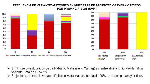 “En La Habana, Matanzas y Camagüey lo que ha predominado en los pacientes graves y críticos es la variante beta. Pero en Matanzas, ya en junio, ha predominado la delta. De que hay casos graves y críticos por delta, los hay, aunque es algo que hay que seguir estudiando”, afirmó.