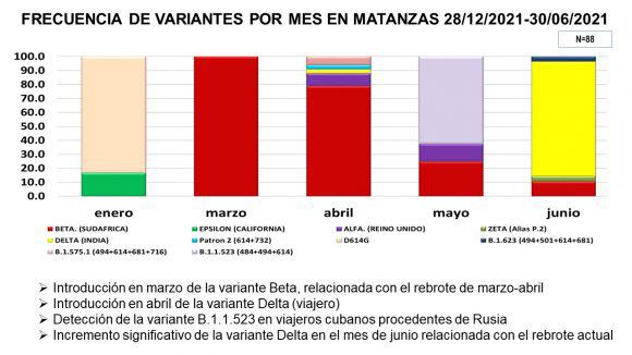 Entre marzo y mayo −continuó−, en Matanzas el 63 % de todo lo encontrado era beta. En junio, el 83 % era delta, todavía beta estaba en un 10 %. Datos de hoy confirman que en julio lo que se ha detectado es 100 % delta.