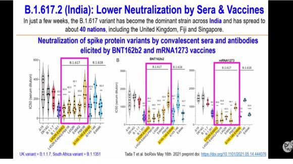 Citó un estudio realizado con las vacunas de Pfizer y Moderna. Con la variante sudafricana (beta) el conteo de anticuerpos que genera el suero de un convaleciente para neutralizar el virus es inferior si se le compara con la D614G.