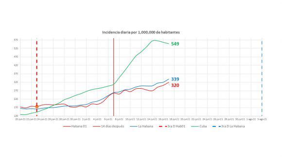 “La última raya vertical azul discontinua que está al final del gráfico es el día 3 de agosto. Alrededor de esa fecha, todos los municipios de La Habana deben haber recibido la tercera dosis, pero faltarían dos semanas para alcanzar el potencial inmunológico que arrojaron los estudios de eficacia”, precisó