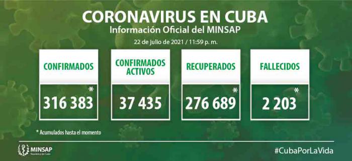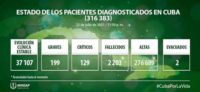 De los 316 mil 383 pacientes diagnosticados con la enfermedad, se mantienen ingresados 37 mil 435 (11.8%), de ellos 37 mil 107 (99,1%) con evolución clínica estable. Se acumulan 2 203 fallecidos (66 en el día), letalidad de 0,69% vs 2.15% en el mundo y 2,62% en Las Américas; dos evacuados, 54 retornados a sus países, en el día hubo 5 mil 932 altas (2951 menos), se acumulan 276 mil 689 pacientes recuperados (87.4%).