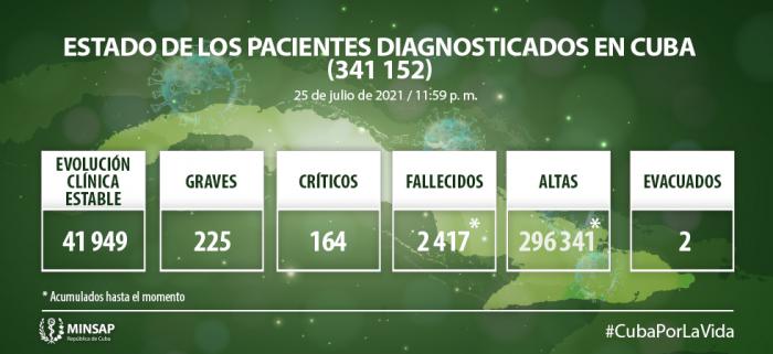 De los 341 mil 152 pacientes diagnosticados con la enfermedad se mantienen ingresados 42 mil 338, de ellos 41 mil 949 con evolución clínica estable. Se acumulan 2 417 fallecidos (66 en el día), letalidad de 0,70% vs 2.14% en el mundo y 2,61% en Las Américas; dos evacuados, 54 retornados a sus países, en el día hubo 7 mil 927 altas, se acumulan 296 mil 341 pacientes recuperados. Se atienden en las terapias intensivas 389 pacientes confirmados de ellos 164 críticos y 225 graves.