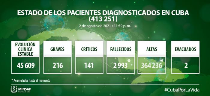 De los 413 mil 251 pacientes diagnosticados con la enfermedad se mantienen ingresados 45 mil 966, de ellos 45 mil 609 con evolución clínica estable. Se acumulan 2 993 fallecidos (80 en el día), letalidad de 0,72% vs 2.13% en el mundo y 2,60% en Las Américas; dos evacuados, 54 retornados a sus países, en el día hubo 7 mil 538 altas, se acumulan 364 mil 236 pacientes recuperados (88,1%). Se atienden en las terapias intensivas 357 pacientes confirmados de ellos 141 críticos y 216 graves.