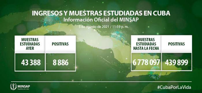 Para COVID-19 se estudiaron 43 mil 388 muestras, resultando 8 mil 886 muestras positivas. El país acumula 6 millones 778 mil 087 muestras realizadas y 439 mil 899 positivas.