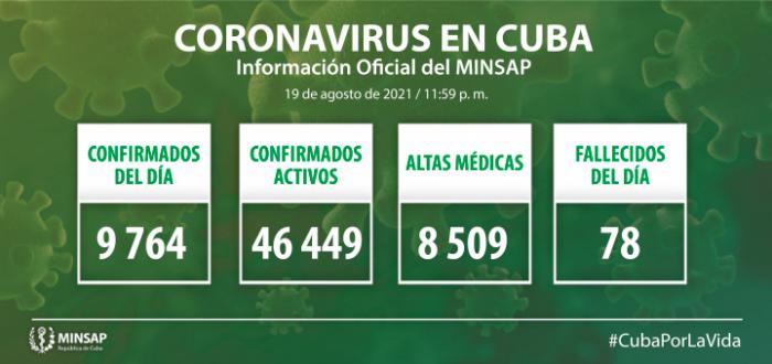 Hasta el 19 agosto se reportan 190 países y 32 territorios con casos de COVID-19, asciende a 210 millones 784 mil 682 los casos confirmados (+ 724 mil 914) con 17 millones 645 mil 248 casos activos y 4 millones 416 mil 88 fallecidos (+ 11 mil 822) para una letalidad de 2,1% (=).