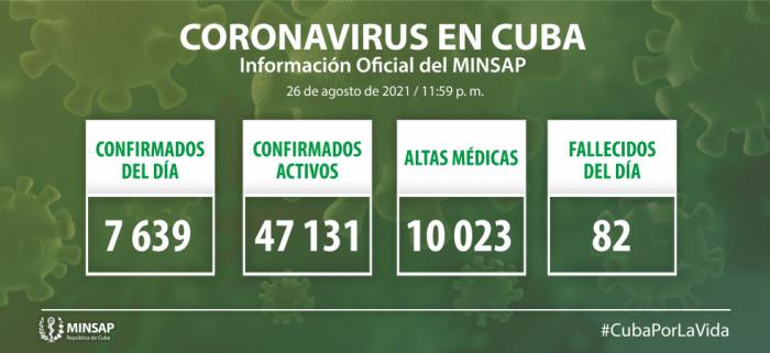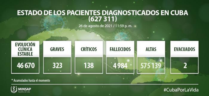 De los 627 mil 311 pacientes diagnosticados con la enfermedad se mantienen ingresados 47 mil 131, de ellos 46 mil 670 con evolución clínica estable. Se acumulan 4 984 fallecidos (82 en el día), letalidad de 0,79% vs 2,08% en el mundo y 2,51% en Las Américas; dos evacuados, 55 retornados a sus países, en el día hubo 10 mil 023 altas, se acumulan 575 mil 139 pacientes recuperados (91,7 %). Se atienden en las terapias intensivas 461 pacientes confirmados de ellos 138 críticos y 323 graves.