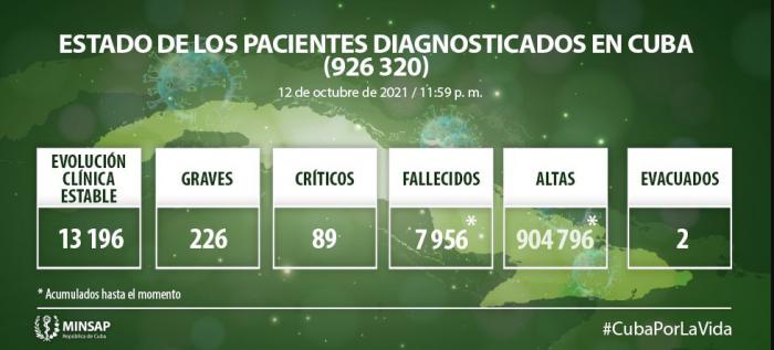 De los 926 mil 320 pacientes diagnosticados con la enfermedad se mantienen ingresados 13 mil 511, de ellos 13 mil 196 con evolución clínica estable. Se acumulan 7 mil 956 fallecidos (28 en el día), letalidad de 0,86% vs 2,04% en el mundo y 2,45% en Las Américas; dos evacuados, 55 retornados a sus países, en el día hubo 4 mil 099 altas, se acumulan 904 mil 796 pacientes recuperados (97,7%). Se atienden en las terapias intensivas 315 pacientes confirmados de 89 críticos y 226 graves.