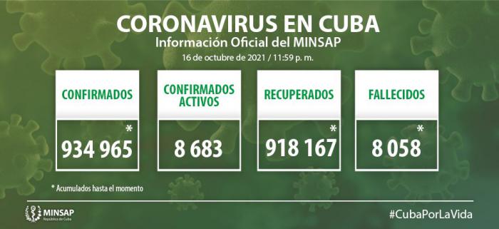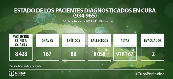De los 934 mil 965 pacientes diagnosticados con la enfermedad se mantienen ingresados 8 mil 683, de ellos 8 mil 428 con evolución clínica estable. Se acumulan 8058 fallecidos (21 en el día), letalidad de 0,86% vs 2,04% en el mundo y 2,45% en Las Américas; dos evacuados, 55 retornados a sus países. En el día hubo 2 mil 274 altas, se acumulan 918 mil 167 pacientes recuperados (98,2%). Se atienden en las terapias intensivas 255 pacientes confirmados de 88 críticos y 167 graves.