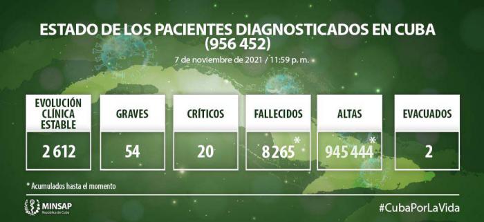 De los 956 mil 452 pacientes diagnosticados con la enfermedad, se mantienen ingresados 2 mil 686, de ellos 2 mil 612 con evolución clínica estable. Se acumulan 8 265 fallecidos (3 en el día), letalidad de 0,86% vs 2,02% en el mundo y 2,45% en Las Américas; dos evacuados, 55 retornados a sus países, en el día hubo 423 altas, se acumulan 945 mil 444 pacientes recuperados (98,8%). Se atienden en las terapias intensivas 74 pacientes confirmados de ellos 20 críticos y 54 graves.