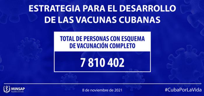 Tienen esquema de vacunación completo 7 810 402 personas, que representa el 69,8% de la población cubana.