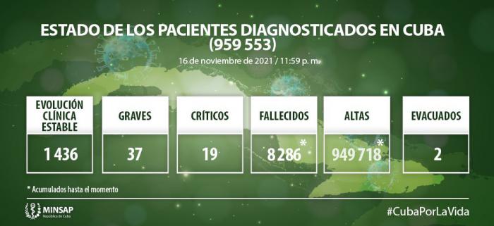 De los 959 mil 553 pacientes diagnosticados con la enfermedad, se mantienen ingresados mil 492, de ellos mil 436 con evolución clínica estable. Se acumulan 8 286 fallecidos (dos en el día), letalidad de 0,86% vs 2,01% en el mundo y 2,44% en Las Américas; dos evacuados, 55 retornados a sus países, en el día hubo 378 altas, se acumulan 949 mil 718 pacientes recuperados (98,98%). Se atienden en las terapias intensivas 56 pacientes confirmados de ellos 19 críticos y 37 graves.