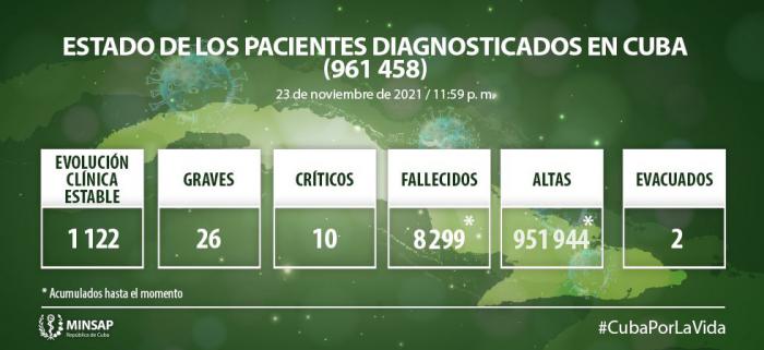 De los 961 mil 458 pacientes diagnosticados con la enfermedad, se mantienen ingresados mil 158, de ellos mil 122 con evolución clínica estable. Se acumulan 8 299 fallecidos (1 en el día), letalidad de 0,86% vs 2,0% en el Mundo y 2,43% en Las Américas; dos evacuados, 55 retornados a sus países, en el día hubo 284 altas, se acumulan 951 mil 944 pacientes recuperados (99,0%). Se atienden en las terapias intensivas 36 pacientes confirmados de ellos 10 críticos y 26 graves.