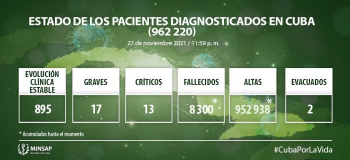 De los 962 mil 220 pacientes diagnosticados con la enfermedad, se mantienen ingresados 925, de ellos 895 con evolución clínica estable. Se acumulan 8 300 fallecidos (0 en el día), letalidad de 0,86% vs 2,0% en el Mundo y 2,43% en Las Américas; dos evacuados, 55 retornados a sus países, en el día hubo 199 altas, se acumulan 952 mil 938 pacientes recuperados (99,0%). Se atienden en las terapias intensivas 30 pacientes confirmados de ellos 13 críticos y 17 graves.