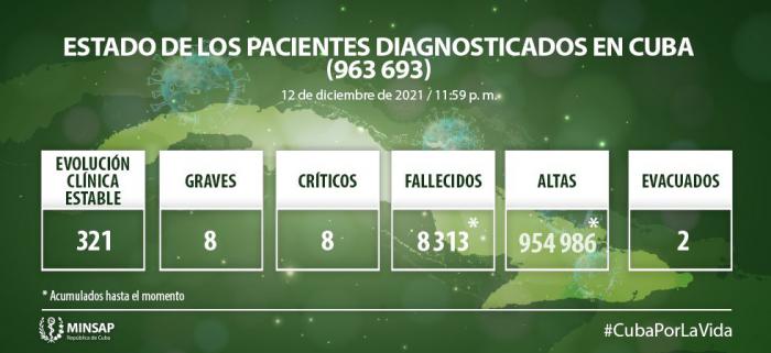 De los 963 mil 693 pacientes diagnosticados con la enfermedad, se mantienen ingresados 337, de ellos 321 con evolución clínica estable. Se acumulan 8 mil 313 fallecidos (0 en el día), letalidad de 0,86 % vs 1,97 % en el mundo y 2,40 % en Las Américas; dos evacuados, 55 retornados a sus países, en el día hubo 59 altas, se acumulan 954 mil 986 pacientes recuperados (99,1 %). Se atienden en las terapias intensivas 16 pacientes confirmados de ellos ocho críticos y ocho graves.