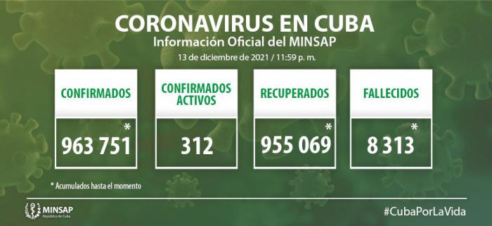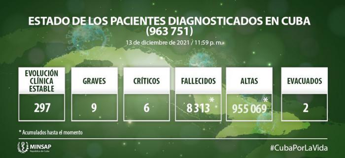 De los 963 mil 751 pacientes diagnosticados con la enfermedad, se mantienen ingresados 312, de ellos 297 con evolución clínica estable. Se acumulan 8 mil 313 fallecidos (0 en el día), letalidad de 0,86% vs 1,97% en el mundo y 2,40% en Las Américas; dos evacuados, 55 retornados a sus países, en el día hubo 83 altas, se acumulan 955 mil 069 pacientes recuperados (99,1%). Se atienden en las terapias intensivas 15 pacientes confirmados de ellos 6 críticos y 9 graves.