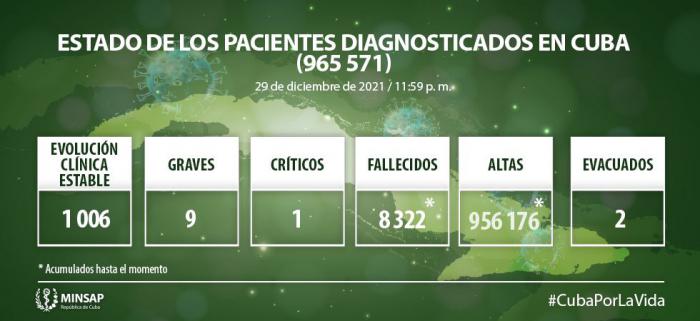 De los 965 mil 571 pacientes diagnosticados con la enfermedad, se mantienen ingresados 1016, de ellos 1006 con evolución clínica estable. Se acumulan 8 mil 322 fallecidos (1 en el día), letalidad de 0,86% vs 1,92% en el Mundo y 2,34% en Las Américas; dos evacuados, 55 retornados a sus países, en el día hubo 79 altas, se acumulan 956 mil 176 pacientes recuperados (99,0%). Se atienden en las terapias intensivas 10 pacientes confirmados de ellos 1 crítico y 9 graves.