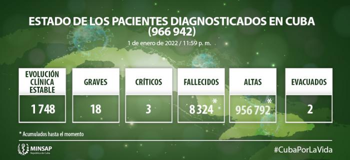 De los 966 mil 942 pacientes diagnosticados con la enfermedad, se mantienen ingresados mil 769, de ellos mil 748 con evolución clínica estable. Se acumulan 8 mil 324 fallecidos (1 en el día), letalidad de 0,86% vs 1,88% en el Mundo y 2,3% en Las Américas; dos evacuados, 55 retornados a sus países, en el día hubo 172 altas, se acumulan 956 mil 792 pacientes recuperados (98,9%). Se atienden en las terapias intensivas 21 pacientes confirmados de ellos 3 críticos y 18 graves.